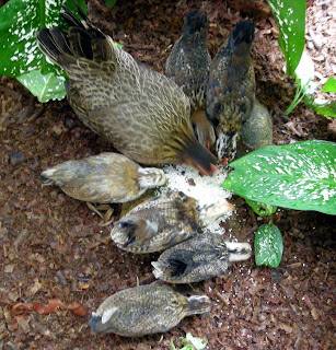 Once again we have baby chicks. When these hens get broody, they go off and hide somewhere to sit on their eggs. I was beginning to think that something was eating our chickens until one hen showed up with four chicks and another showed up a few days later with one chick. I don't know what we will do with them.